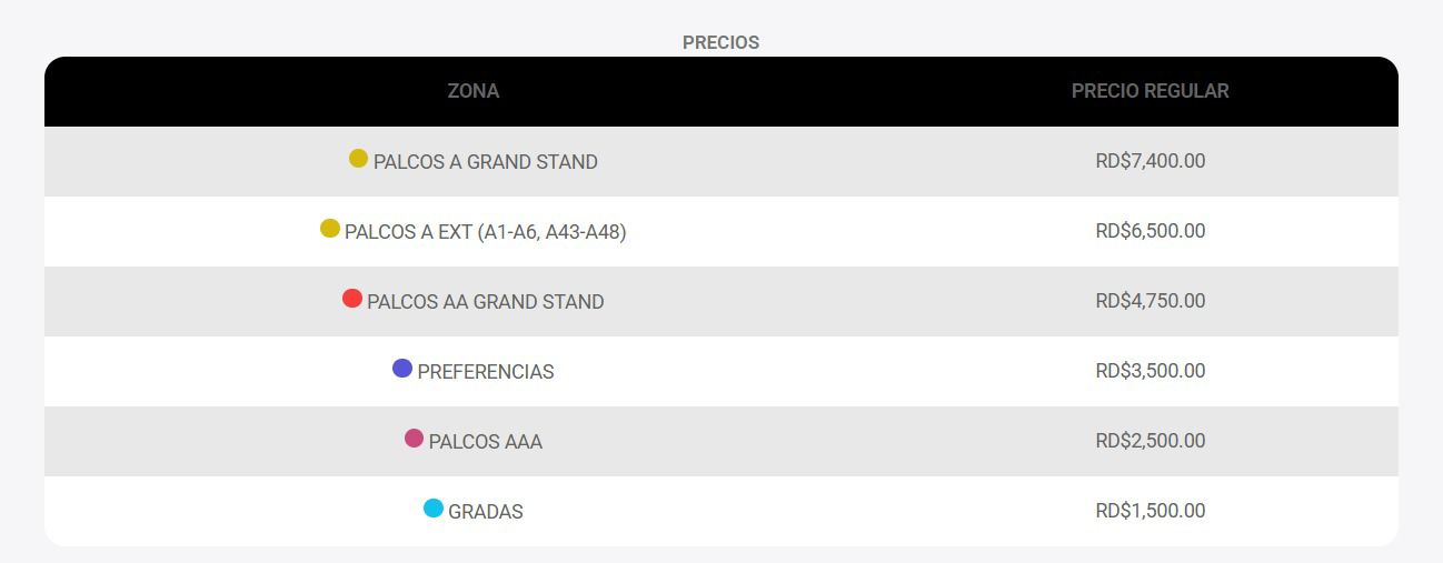 La producción del evento dio a conocer la escala de precios para las distintas zonas del recinto, encabezada por los palcos A Grand Stand con un costo de RD$7,400, seguidos por los palcos A Ext (A1-A6 y A43-A48) a RD$6,500. Los palcos AA Grand Stand tienen un precio de RD$4,750, mientras que las preferencias están disponibles por RD$3,500.
