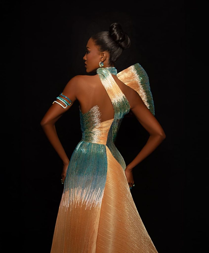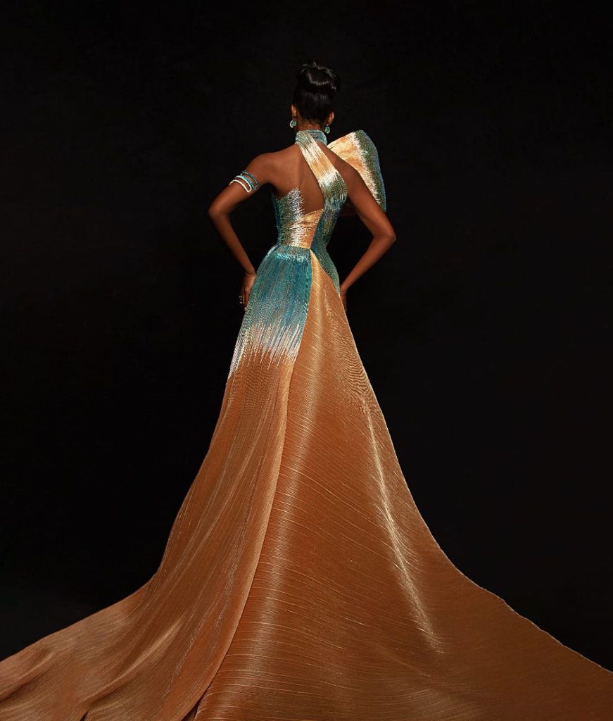 “Este deslumbrante vestido está inspirado en las cristalinas aguas del mar y las playas más radiantes de las Islas Turcos y Caicos con sus hermosas tonalidades. Estas representan la fuerza y sutileza que posee la mujer, siendo únicamente comparadas con las implacables olas del mar, que a la vez nos transmiten paz y sofisticación a través de su movimiento”, detalló el diseñador.